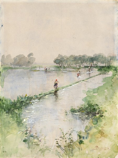 Pompeo Mariani "Risaia con le mondine" tecnica mista su carta (cm 31x22) Firmat