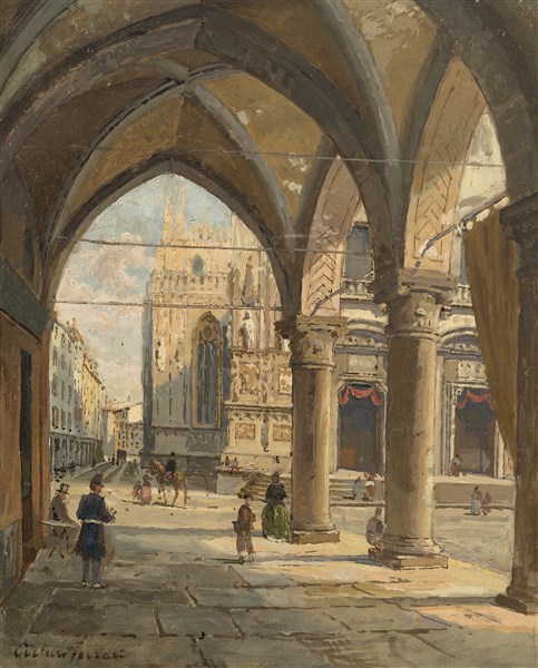 Arturo Ferrari "La Corsia dei Servi con il Duomo di Milano sullo sfondo" olio s