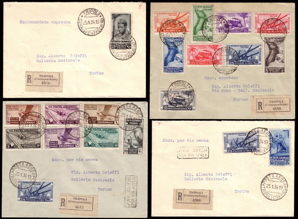 "Decennale della Marcia su Roma". Serie completa di 18 valori, più 2 complementari della stessa serie, su 4 buste viaggiate da Tripoli per Torino
