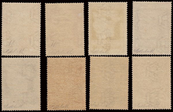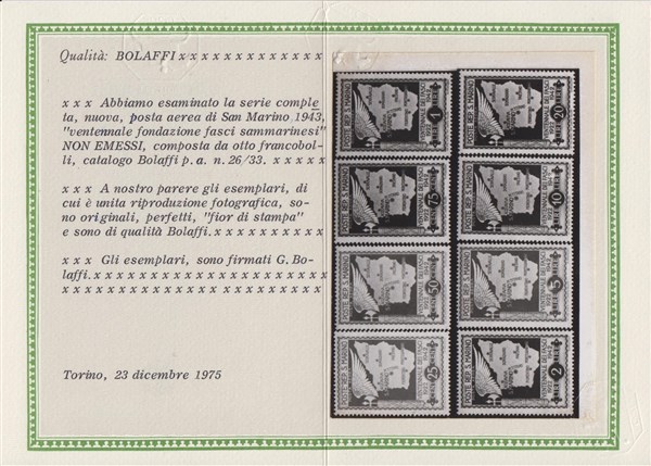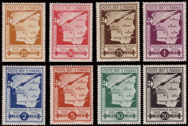 Posta aerea non emessa "Cartina di San Marino con fascio e ala". Serie completa di 8 valori. Impercettibile traccia di linguella solo su alcuni valori