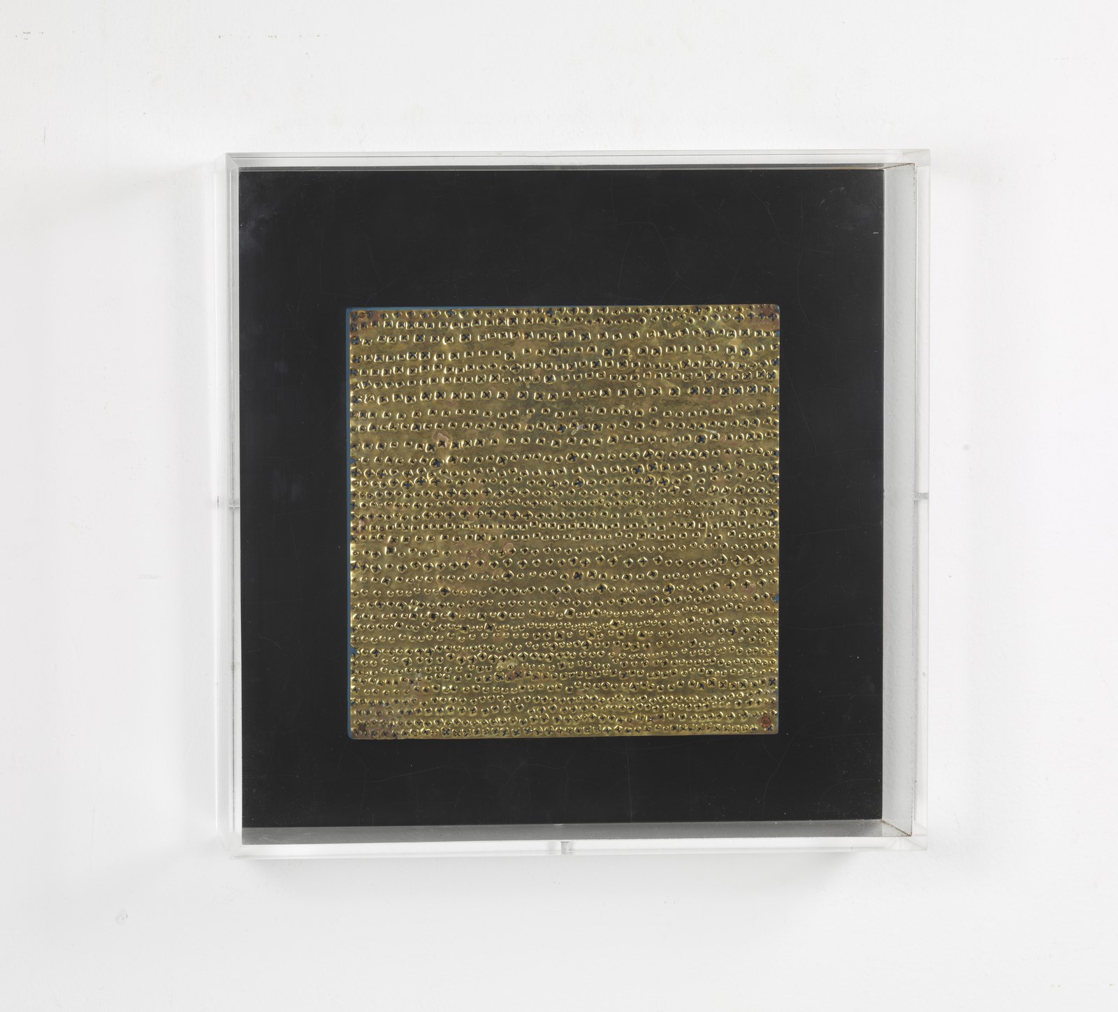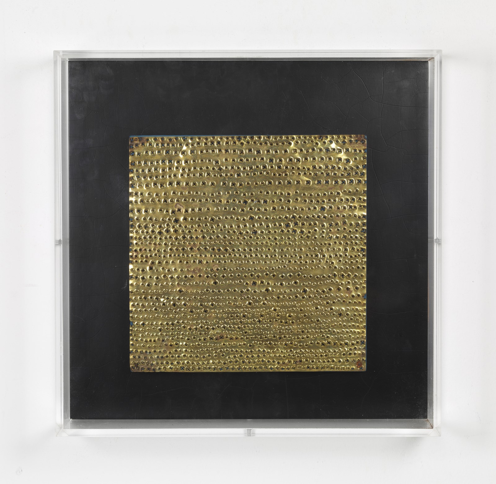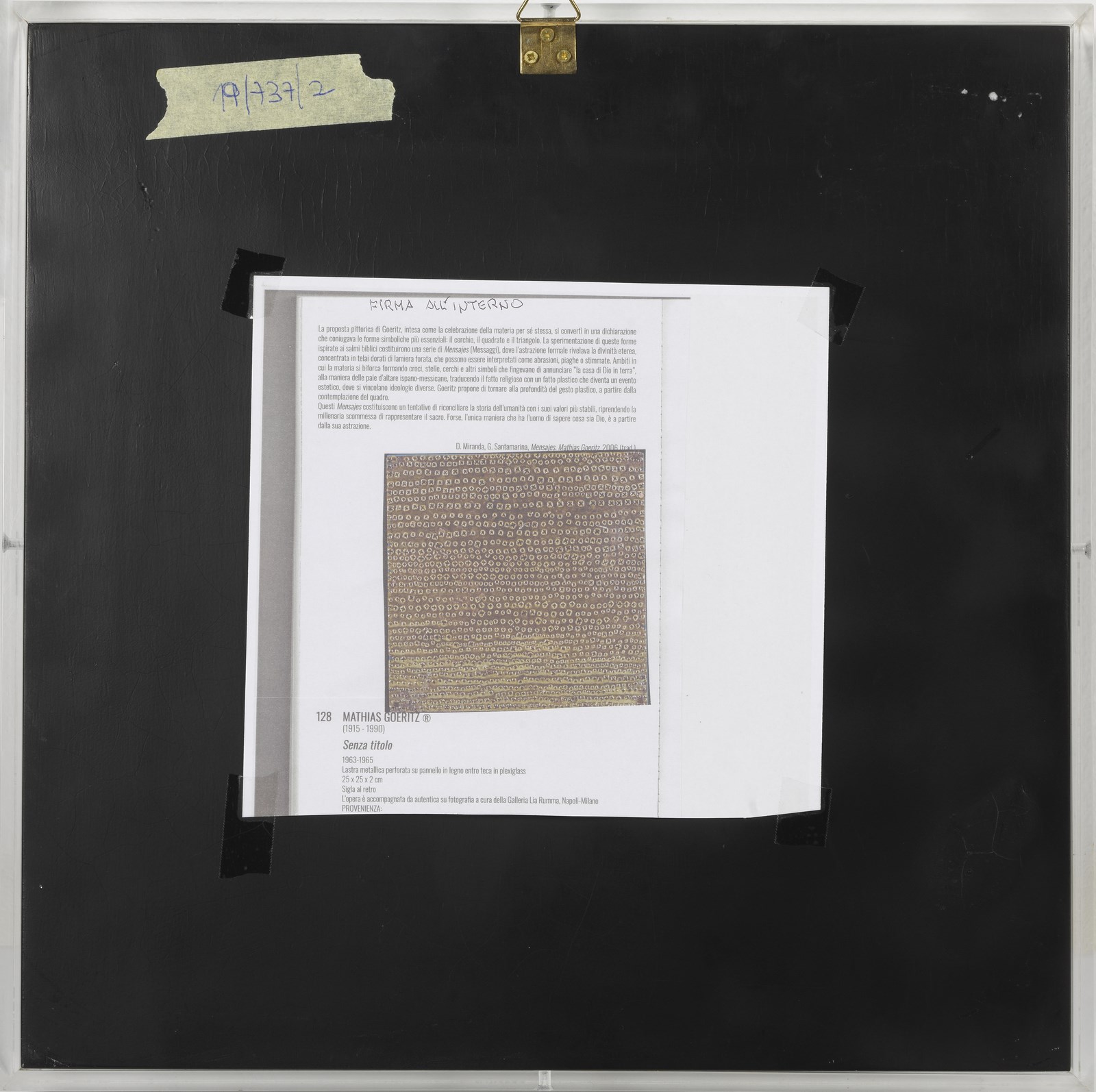 GOERITZ MATHIAS (1915 - 1990) Senza titolo. Tecnica mista su tavola. Cm 25,00 x 25,00 x 2,00. 1963/65. Monogramma (M.G) al retro. L'opera è composta da un foglio metallico perforato applicato ad un pannello di legno attraverso 4 chiodi posti in corrispondenza degli angoli. Certificato di autenticità della Galleria Lia Rumma, Napoli. . Cornice presente