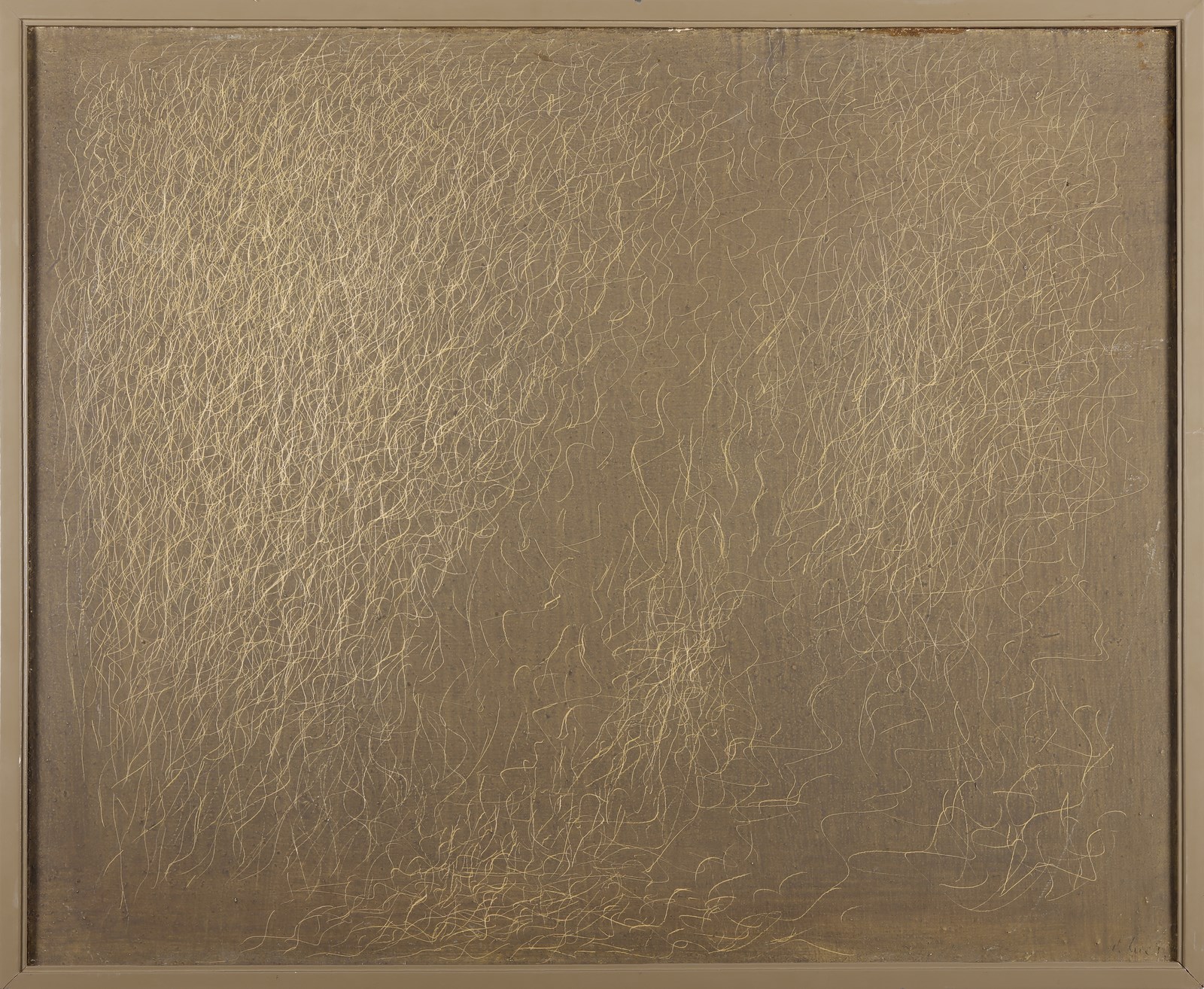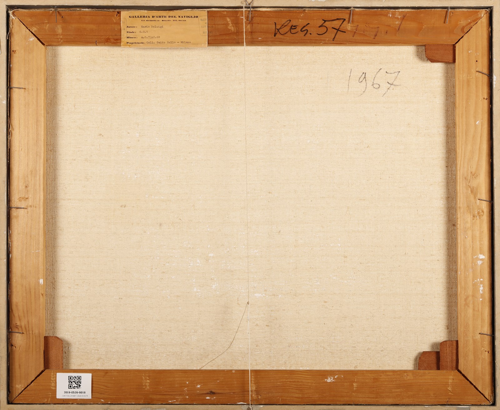 DE LUIGI MARIO (1901 - 1978) Senza titolo. 1967. Tecnica mista su tela. Cm 73,00 x 60,00. Firma in basso a destra. Al retro anno e cartiglio descrittivo Galleria Del Naviglio, Milano. Autentica su fotografia di Caterina De Luigi. Provenienza: Galleria Blu, Milano; Collezione G. Ballo, Milano; Collezione privata, Milano. Cornice presente