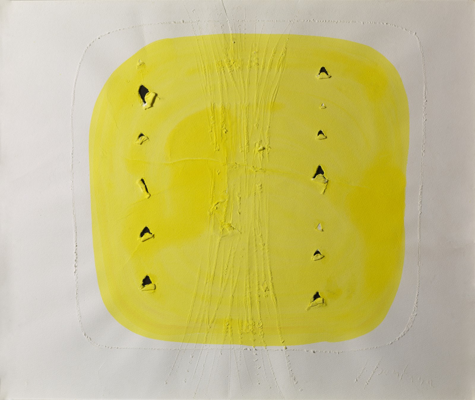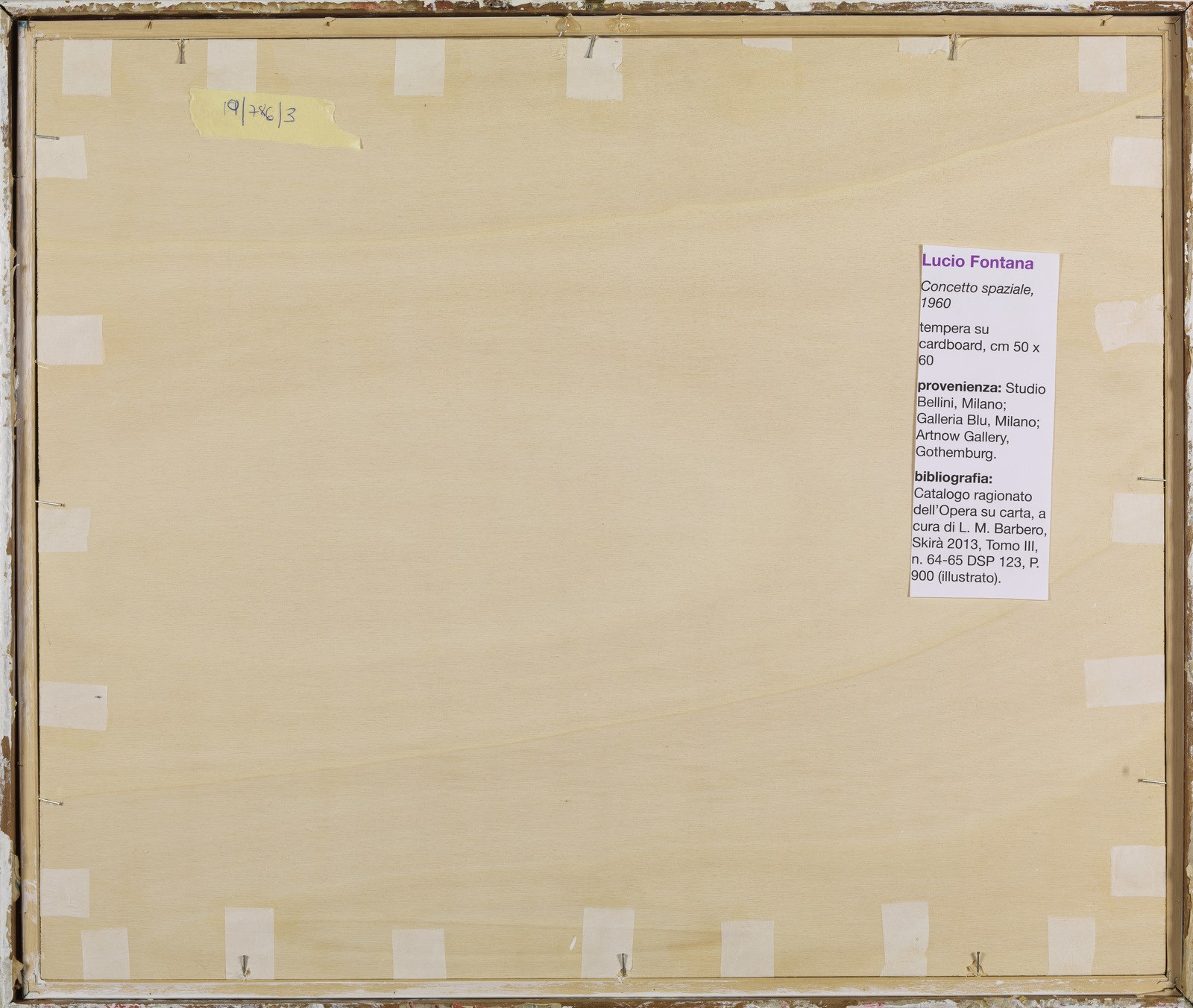 FONTANA LUCIO (1899 - 1960) Concetto spaziale. 1960. Acquarello, strappi, graffiti e buchi su carta assorbente. Cm 60,00 x 50,00. Firma in basso a destra. Pubblicazione: Lucio Fontana - Catalogo ragionato delle opere su carta a cura di Luca Massimo Barbero, Tomo III, Skira Editore, 2013, sezione disegni spaziali 1956 -1968, pag.900. Provenienza:Studio Bellini, Milano; Galleria Blu, Milano; Artnow Gallery, Gothemburg. Cornice presente