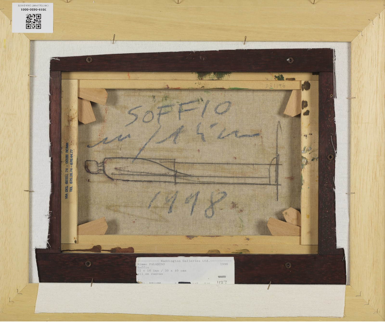 PALADINO MIMMO (n. 1948) Soffio. . 1998. Olio su tela . Cm 40,00 x 30,00. Al retro titolo, firma e anno, cartiglio descrittivo Waddington Galleries Ltd. Si ringrazia l'Archivio Paladino per aver confermato verbalmente l'autenticità dell'opera. Cornice presente