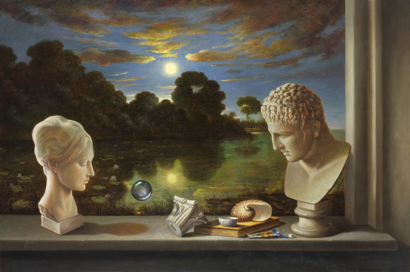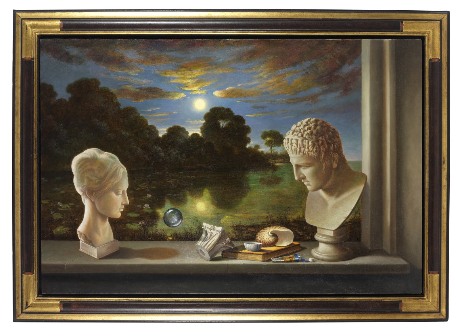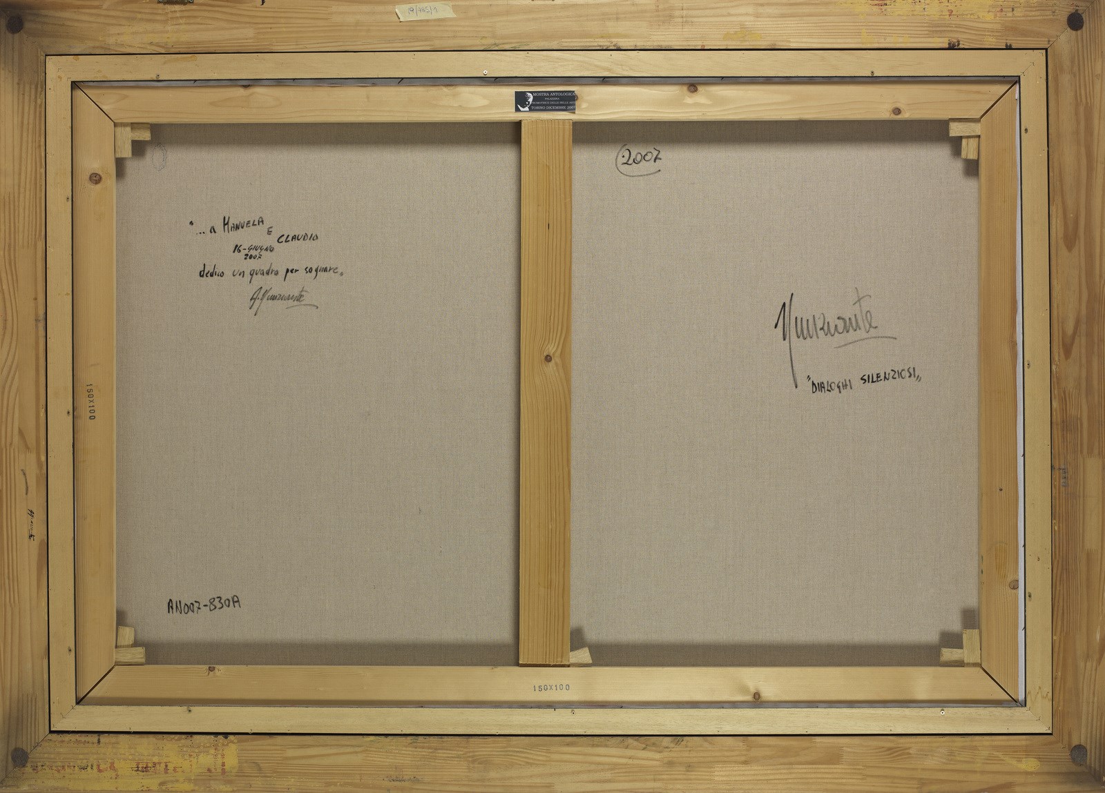 NUNZIANTE ANTONIO (n. 1956) Dialoghi silenziosi. 2007. Olio su tela . Cm 150,00 x 100,00. Firma e anno in basso a destra. Al retro titolo, firma, anno e dedica. Esposizione: Mostra Antologica Palazzina promotrice delle belle arti, Torino, Dicembre 2007. Opera archiviata presso l'Archivio delle opere di Antonio Nunziante, coma da documentazione fotografica allegata all'opera riportante il relativo numero d'inventario. Cornice presente