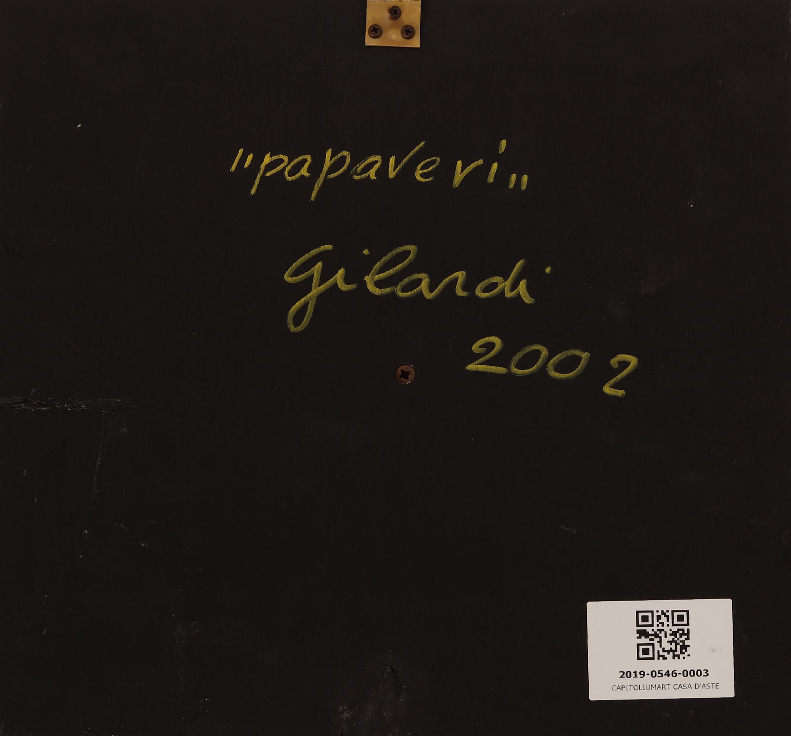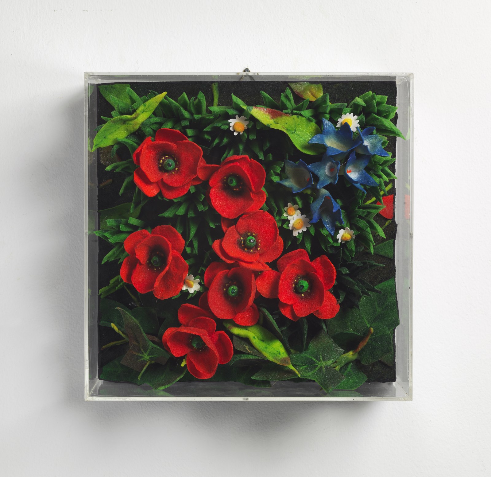 GILARDI PIERO (n. 1942) Papaveri. 2002. Poliuretano espanso dipinto. Cm 30,00 x 30,00 x 15,00. Al retro titolo, firma e anno. Autentica dell'artista su fotografia. Provenienza: Galleria Lombardi, Roma. Pubblicazioni: Flaminio Gualdoni, "Piero Gilardi - Giardini", catalogo della mostra personale dell'artista tenuta presso la Galleria Vinciana dall'11 Febbraio al 14 Marzo 2003, l'opera è fotografata a pagina doppia insieme ad altre 5 opere della stessa dimensione che componevano un giardino fiorito. Entro teca di plexiglass.