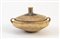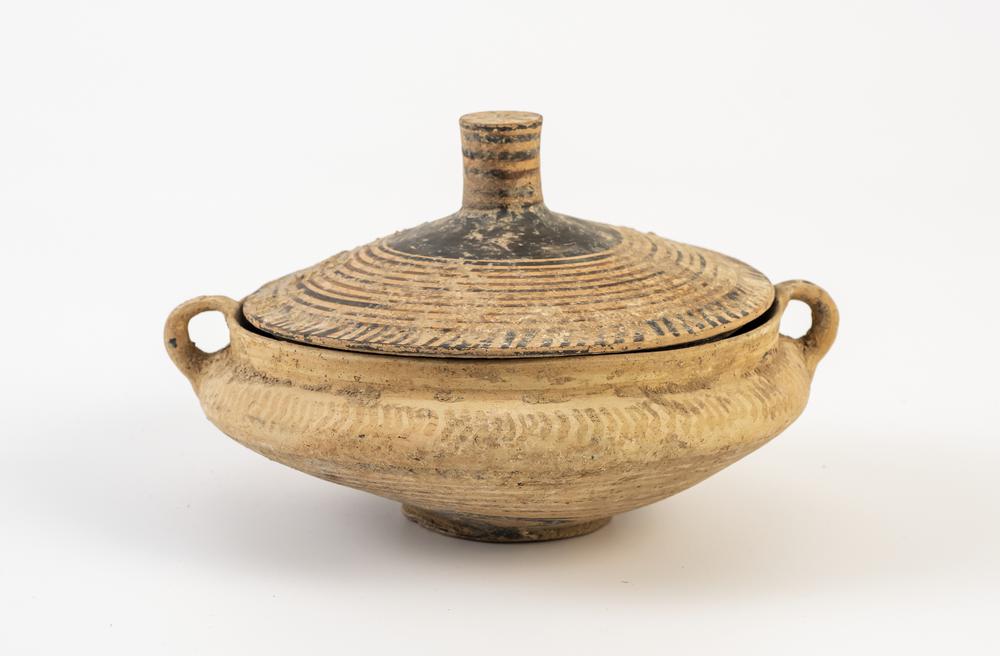 Coppa con orlo a colletto, corpo lenticolare schiacciato, piede a disco, anse a nastro impostate dallorlo alla spalla; coperchio a tesa con presa cilindrica