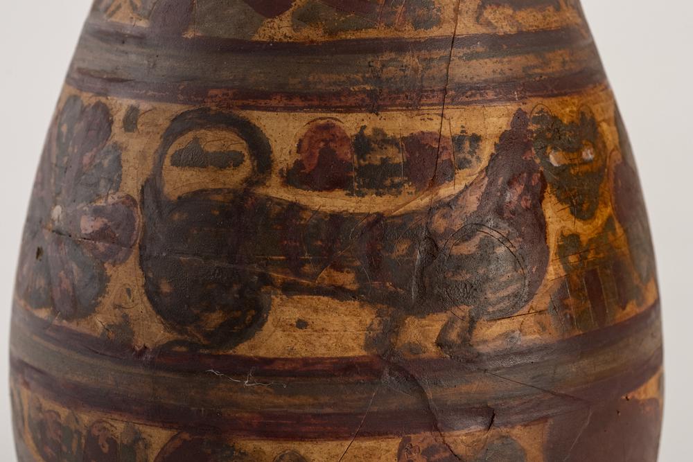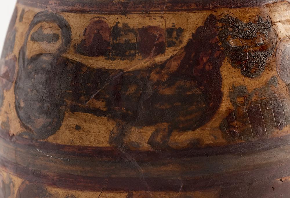 Interno della bocca, collo e ansa verniciati, sulle rotelle rosette, sul collo rosette a puntini, all'interno della bocca fascia in paonazzo, sul ventre tre fasce con animali gradienti a sinistra fra i quali si riconoscono pantere, cigni, lepri; nel campo rosette a macchia nella parte inferiore del vaso motivo a raggiera, fondo del piede risparmiato