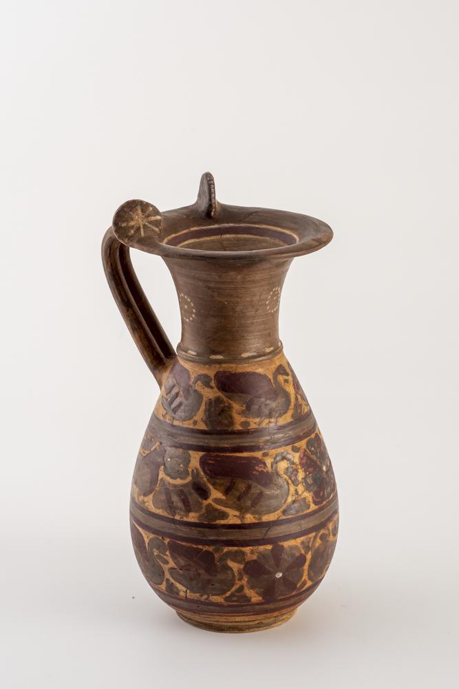 MATERIA E TECNICA: argilla figulina beige; vernice bruna e paonazza, suddipinture in bianco e paonazzo; dettagli resi a graffito; modellata a tornio veloce