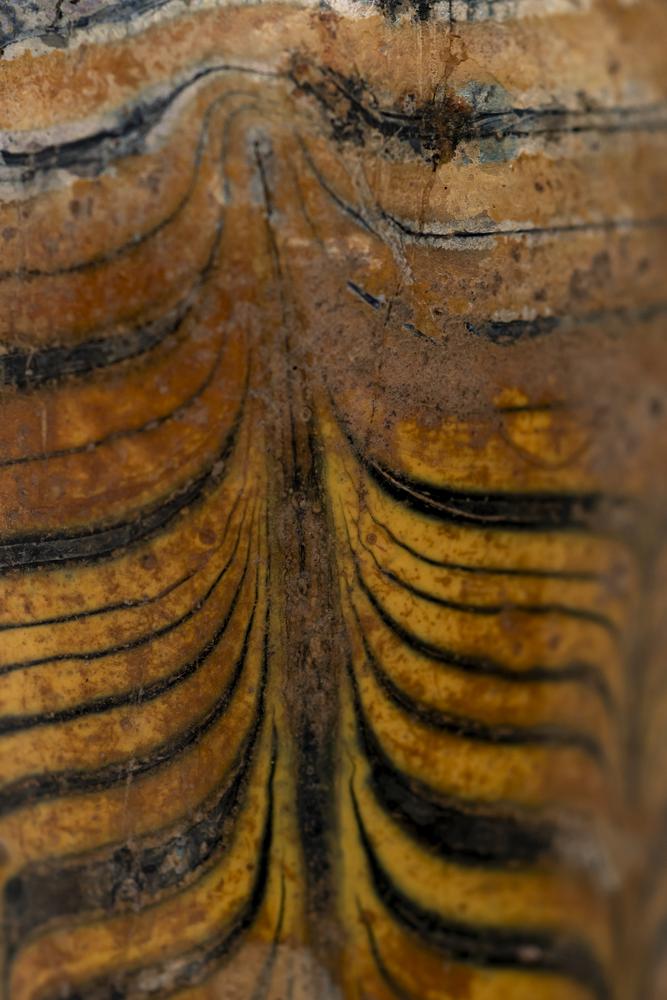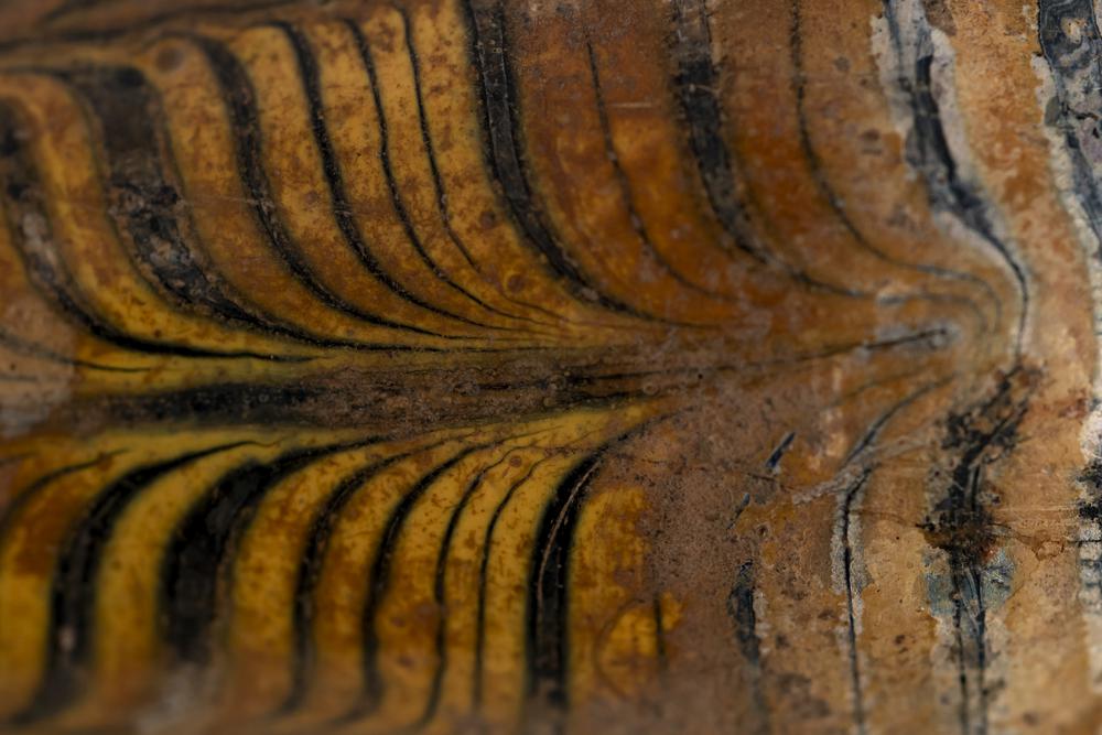 DECORAZIONE: eseguita a pettine con motivo piumato in giallo sul fondo blu