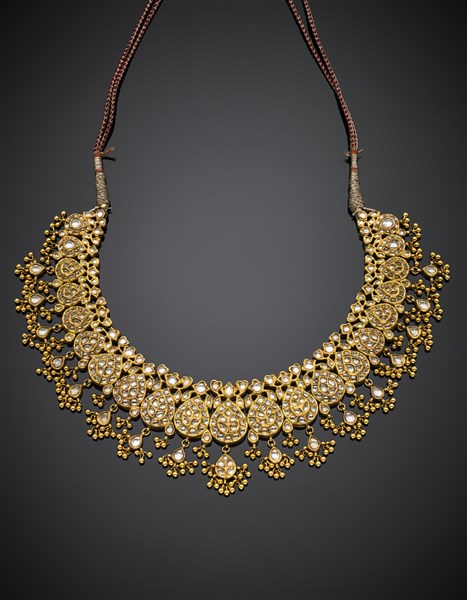Collier in oro giallo con gemme incolori in stile indiano, un cordoncino intrecciato a rifinirla, lunghezza adattabile, lordi g 173,79. Marchio francese di importazione e marchio abraso.