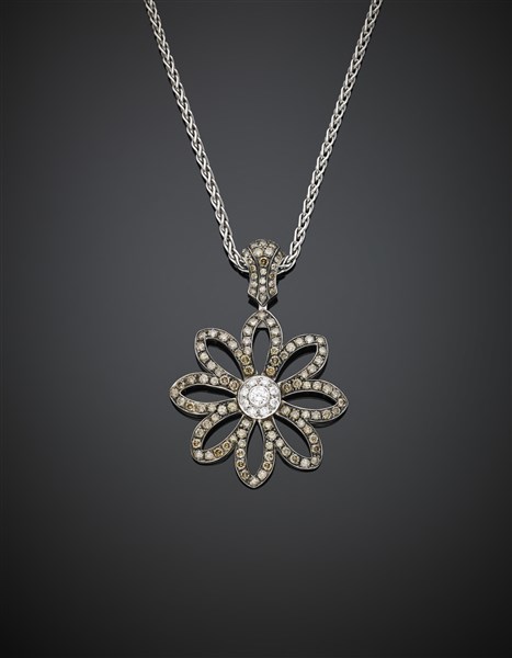 Round colourless and brown diamond white gold flower pendant with chain, diamonds in all ct. 2.50 circa, g 24.30, length cm 45.30 circa. Marked 1312 MI, C. In original Cusi pouch (losses)