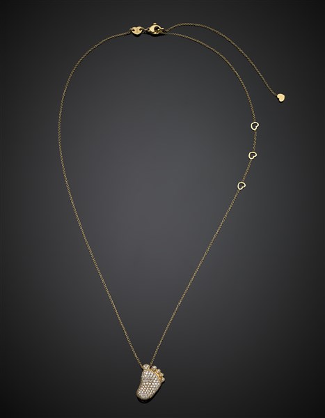 Catenina con pendente a guisa di piede in oro giallo, il pendente rifinito con diamanti a pavè per complessivi ct. 1,00 circa, g 10,61, lungh. cm 63 circa. Firmato Pasquale Bruni, 1940 MI.