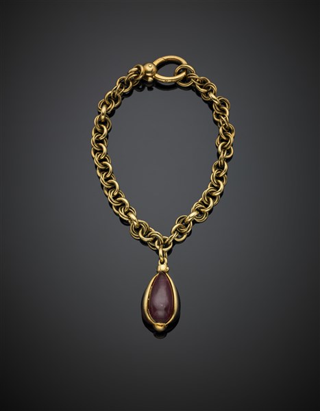 Bracciale a catena in oro giallo con ametista a goccia pendente, g 34,69, lungh. cm 19 circa. Firmato e marcato Pomellato, 469 MI.