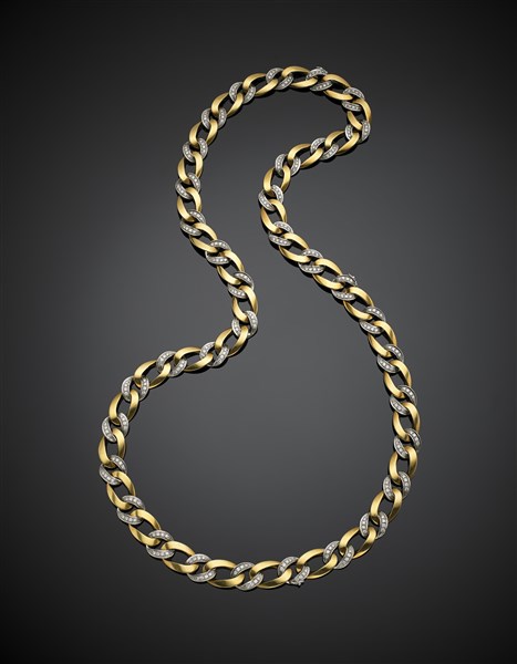 Lunga collana in oro bianco e giallo rifinita con diamanti per complessivi ct. 7,00 circa scomponibile in una collana e due bracciali, complessivi g 223,41, lungh. cm 84 circa. Firmato e marcato Pomellato, 469 MI.