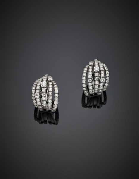 White gold diamond earclips in all ct. 2 circa, g 13.29, length cm 2 circa. Signed and marked Damiani, 3181 AL. (losses)