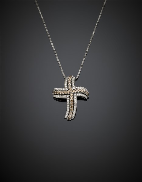 Round colourless and brown diamond white gold cross pendant with chain, in all ct. 2 circa, g 16.10, length cm 47 circa. All signed and marked Damiani, 3181 AL.