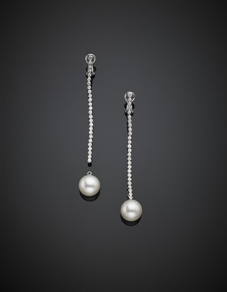 Orecchini pendenti in oro bianco con diamanti per complessivi ct. 0,55 circa e perle removibili di mm 12 circa, g 12,72, lungh. cm 7,60 circa. In scatola "Gioielli di Via della Spiga"