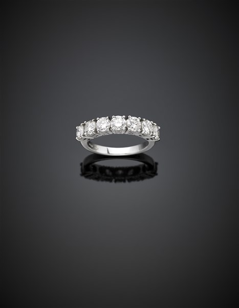 Anello rivière in oro bianco con sette diamanti per complessivi ct. 1,98 circa, g 5,09 misura 14/54. Marcato 2297 MI. Con garanzia originale