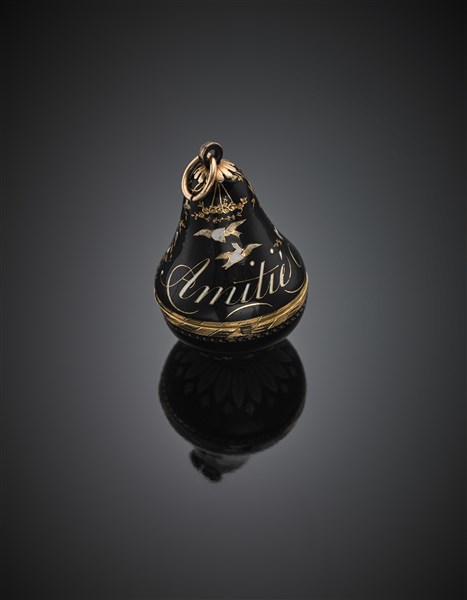 Yellow gold, black and white enamel pear pendant watch with the word "Amitié", g 18.25, length cm 3.80, width cm 2.50 circa. In original fitted case (defects and losses)