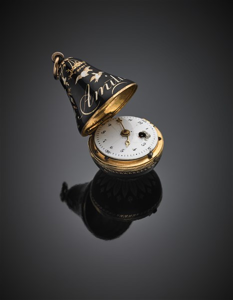 Orologio a pera in oro giallo, smalto nero e bianco con scritta Amitié g 18,2