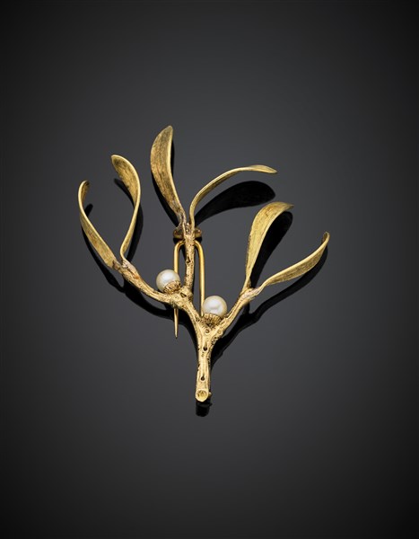 BUCCELLATI Spilla a guisa di vischio in oro giallo cesellato e perle, g 12,89,