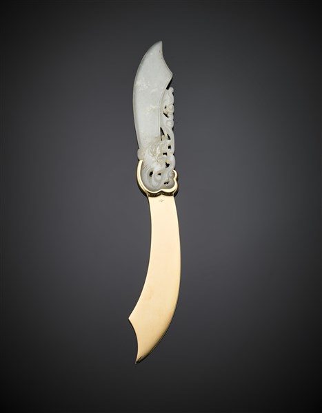 "Ancient jadeite collection, end 1700" Yellow gold and carved jadeite paper knife, g 60.72, length cm 19.50 circa. Signed CIF.