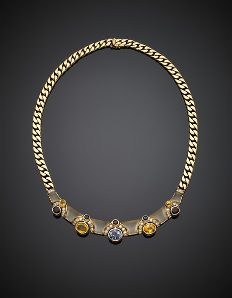 Collier in oro giallo con centrale in quarzo ialino, diamanti per complessivi ct. 1,80 circa, rubini, zaffiri blu e gialli, g 96,86, lungh. cm 45 circa. In scatola Fasano