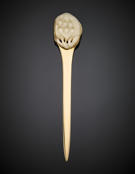 "Ancient jadeite collection, end 1800" Yellow gold and carved jadeite paper knife, g 104.42, length cm 20 circa. Signed Faraone.
