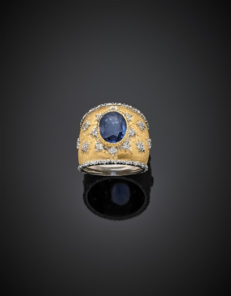 Oval ct. 4.50 circa sapphire and diamond bi-coloured chased gold band ring, g 15.62 size 20.50/60.50.