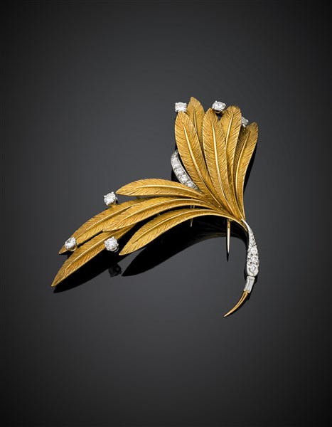 Spilla in oro giallo e platino a guisa di foglie con diamanti rotondi per complessivi ct. 1 circa, g 21,97, lungh. cm 7,50, largh. cm 6,20 circa. Marchi francesi di esportazione.