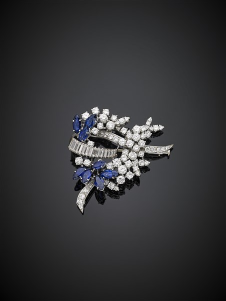 Spilla in oro bianco rifinita con diamanti rotondi e a baguette per complessivi ct. 4,50 circa e zaffiri a marquise g 14,20, lungh. cm 4,10 circa. Marcata AL 877.