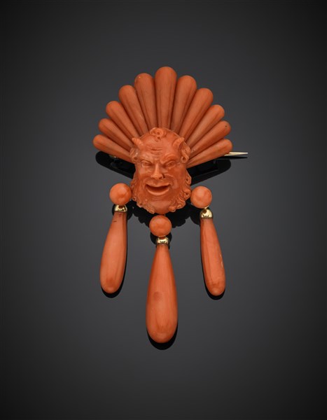 Broche in corallo arancione a guisa di satiro scolpito e incorniciato, rifinito con tre pendenti rimovibili con struttura in oro giallo 585/1000, g 20,91, lungh. cm 8 circa.