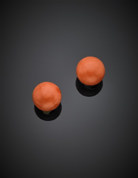 Orange coral and yellow gold button earrings, bead diam. mm 16.30 circa, g 14.05, diam. cm 1.60.