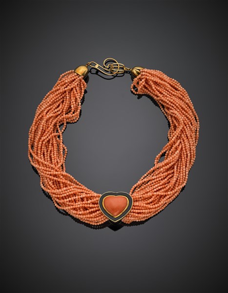 Collier multi fili di corallo rosa con chiusura e centrale a passante in oro giallo, corallo a cuore cabochon e smalto nero, chiusura in oro giallo, g 145,48, lungh. cm 44 circa.