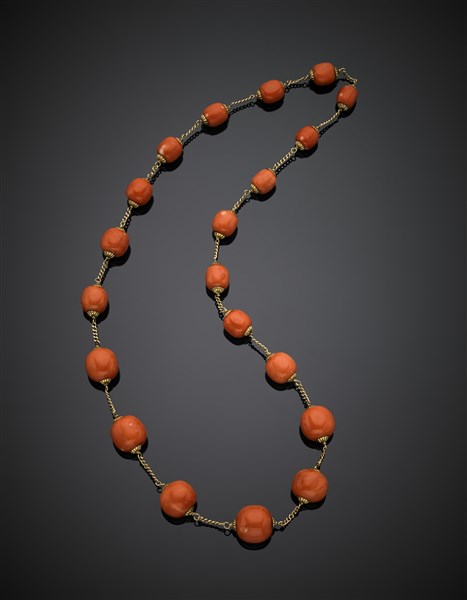 Orange coral graduated bead necklace, bead diam. from mm 10,5 to mm 17,5 with yellow gold chain spacers, g 87.46, length cm 67 circa.