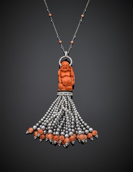 Sautoir in oro bianco rifinito con boules di corallo arancione variegato e diamanti a tenere un pendente in corallo scolpito con nappa a scalare in perle coltivate e corallo, rifinito con diamanti e onice per complessivi ct. 6 circa g 60,27, lungh. cm 95 circa. Marchi francesi di importazione.