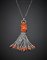 Orange variegated coral bead and diamond white gold sautoir holding a carved coral diamonds and onyx pendant with graduated cultured pearl, coral and diamond tassel, g 60.27, length cm 95 circa. French import marks.