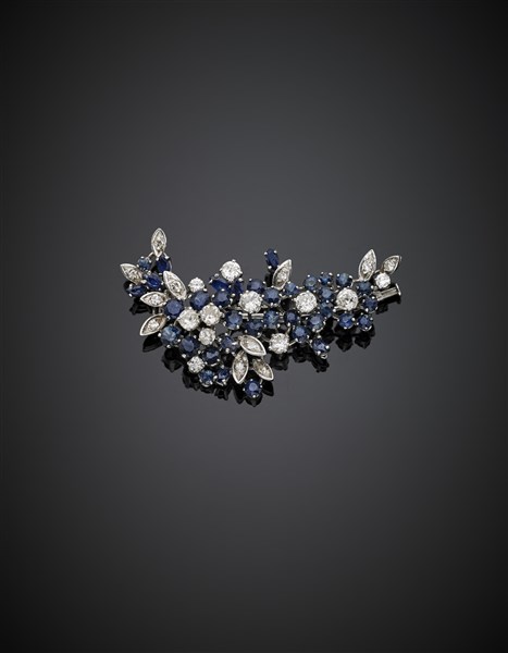 Spilla floreale in oro bianco diamanti per complessivi ct. 2 circa e zaffiri, g 8,67, largh. cm 4,70 circa.
