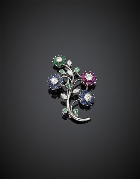 Spilla floreale in oro bianco rifinita con rubini, zaffiri, smeraldi e diamanti per complessivi ct. 1,50 circa, g 9,64, lungh. cm 4,50, largh. cm 3 circa.