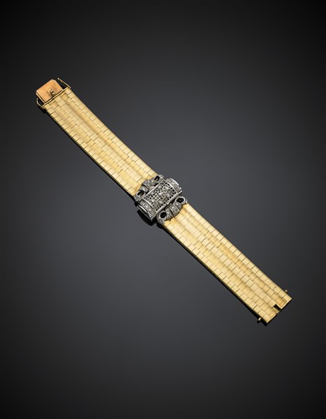 Yellow gold supple bracelet with white chased gold diamond concealed watch, g 102.64, length cm 18, h cm 2.50 circa. Case, dial and movement signed Invicta, on the case n. 23090.