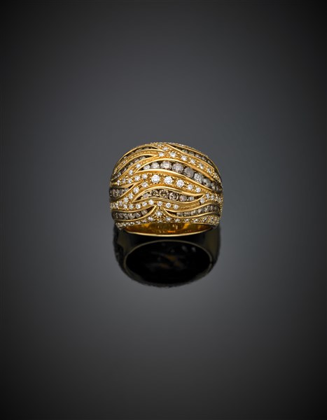 Anello in oro giallo con diamanti incolori e brown per complessivi ct. 3 circa, g 20,78 misura 15/55. Firmato e marcato Damiani, 3181 AL.