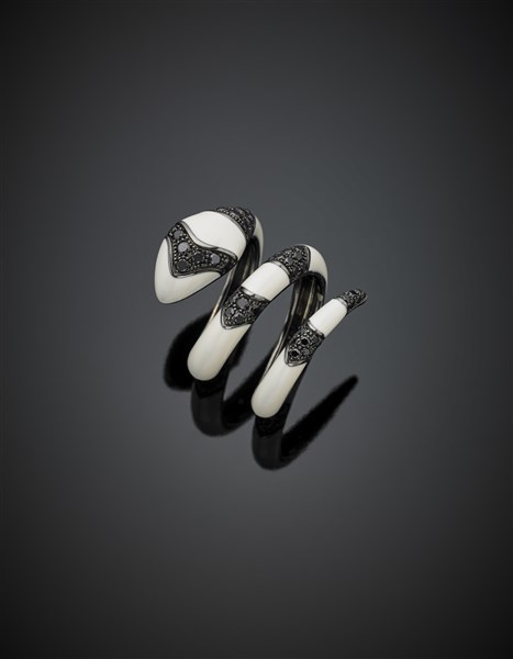 *DI GREGORIO Anello a guisa di serpente in oro rodiato nero, smalto e diamanti