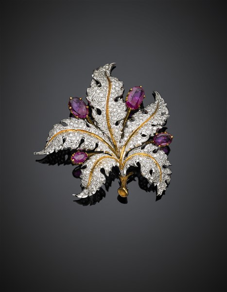 Oval in all ct. 2.80 circa ruby and diamond bi-coloured gold leaf and berry brooch, diamonds in all ct. 2.00 circa, g 20.52, length cm 5.20 circa. Bear the mark Buccellati, 3. in original Mario Buccellati case