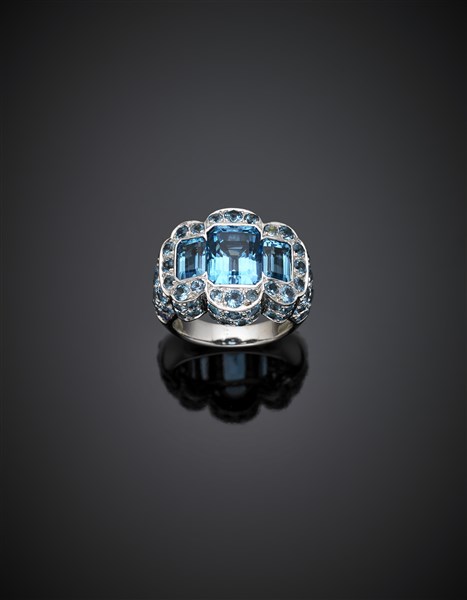 Anello in oro bianco con topazi azzurri rotondi e taglio a smeraldo, g 10,48 misura 10/50. Firmata e marcata Sabbadini Milano. In custodia Sabbadini