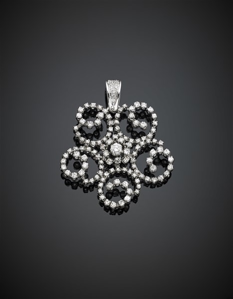 Pendente a fiore in oro bianco rifinito con diamanti per complessivi ct. 3,20 c