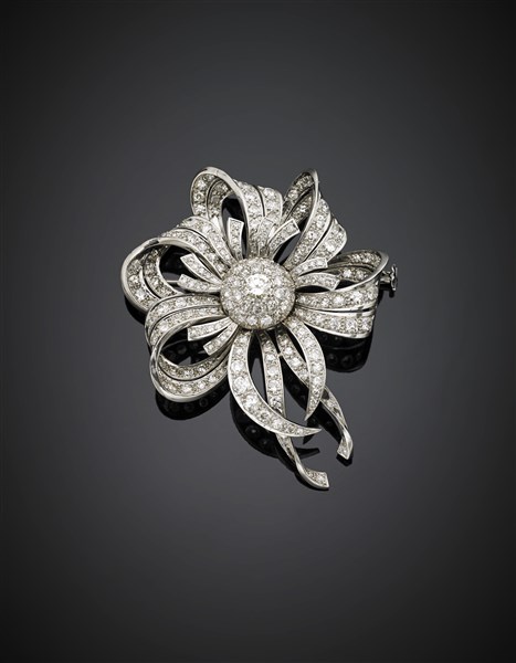 Spilla a fiore e volute in oro bianco e diamanti per complessivi ct. 10,00 circa con centrale di ct. 0,85 circa, g 38,35, lungh. cm 7,50 circa.