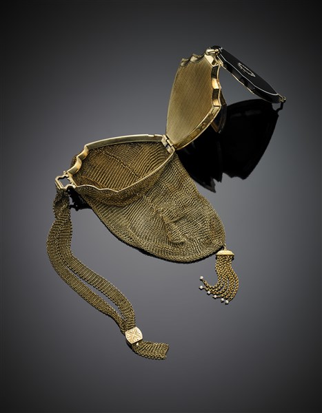 Borsetta in oro giallo 585/1000 con trousse nel coperchio rifinito in smalti ne