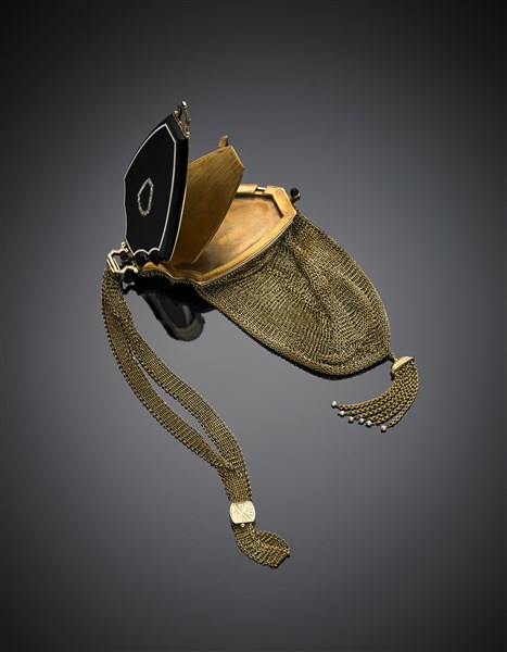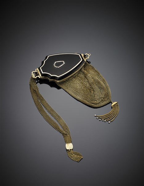 Yellow 14K net handbag with trousse hidden on the black and white enamel cover accented with platinum and diamond motif, g 131.32. Marked 14K, 764 and unknown mark. (defects)