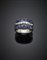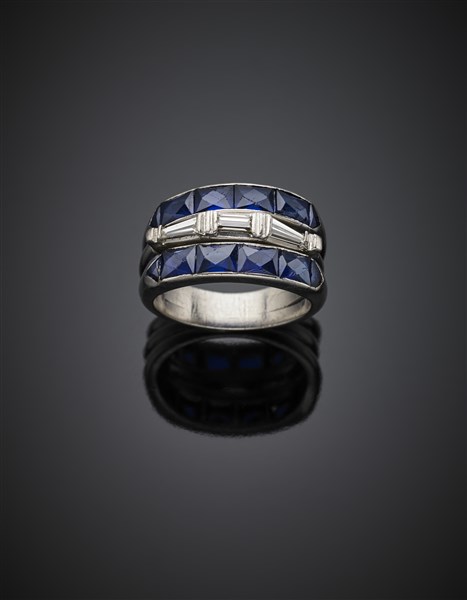 Anello in platino e diamanti con le due fedi in zaffiri sintetici per complessivi ct. 3.50 circa e al centro tre diamanti, due tapered e una baguette per complessivi ct. 0,90 circa g 12,83 misura 15/55.